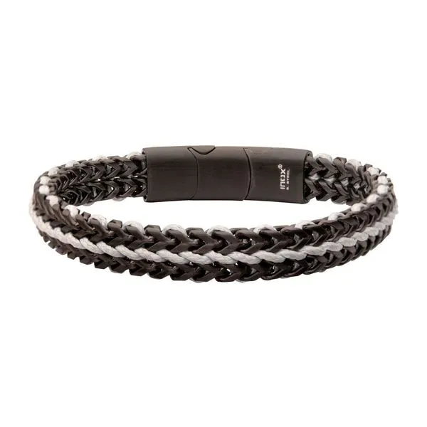 1(713) 802-1977Matte Finish Black IP Stainless Steel Foxtail Chain with White Wax Cord Bracelet 7.75-8.25"