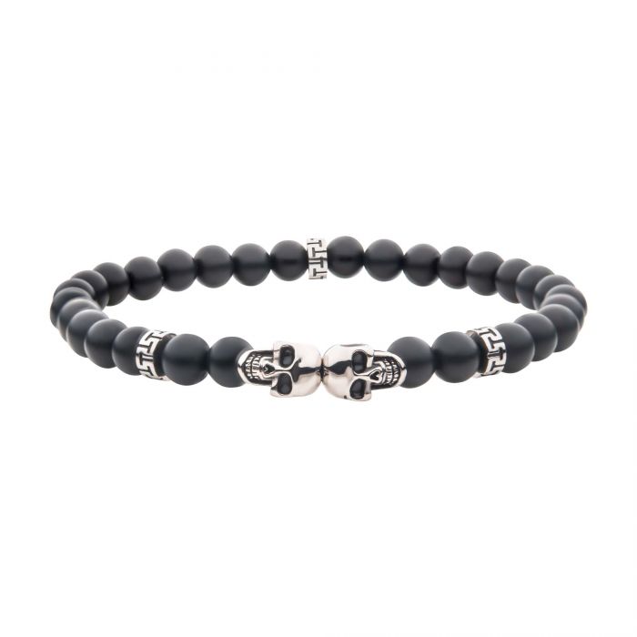 1(713) 802-1977Steel Skull Beads with Genuine Black Agate Stone Beads Bracelet