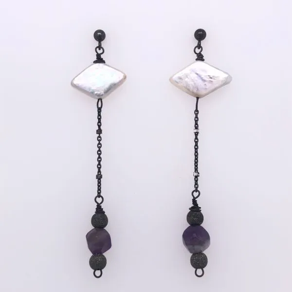 1(713) 802-1977S.S./Blk Rhodium Wire Wrapped Pearl & Amethyst Chain Earrings